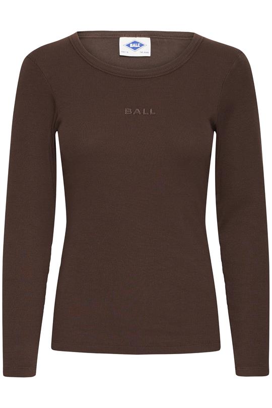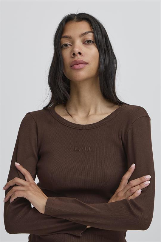 Virkelig lækker basic bluse fra Ball i en flot chokoladebrun farve i en utrolig lækker ribkvalitet, som er super blød og behagelig at have på. Tobelli Ls T-shirt har rund halsudskæring, en forholdsvis tætsiddende pasform og lange ærmer. Blusen er i en lækker blød økologisk bomuldskvalitet med lidt stræk, så den holder sin pasform. Blusen har et fint broderet Ball logo på brystet. Man kan aldrig få nok basisstyles i sin garderobe, og med denne langærmet tee, vil du altid have en styles at sætte under din spencer, skjorte og til vinter strik, eller brug den som den er helt enkelt.