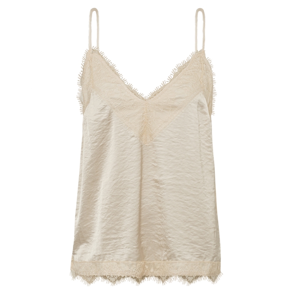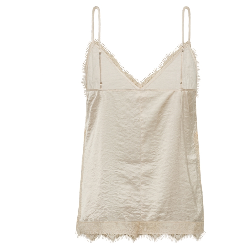 Satintop med blonde, justerbare stropper og slidser Skøn satintop med smuk blondekant og justerbare stropper, der understreger det feminine og elegante look. De høje slidser i siderne skaber et moderne og flatterende fald, mens den bløde, glatte kvalitet sikrer et eksklusivt udtryk. Stylingtip: Kombiner den med en blazer og højtaljede bukser for et sofistikeret look – eller brug den med en nederdel og sandaler for en let og feminin stil.