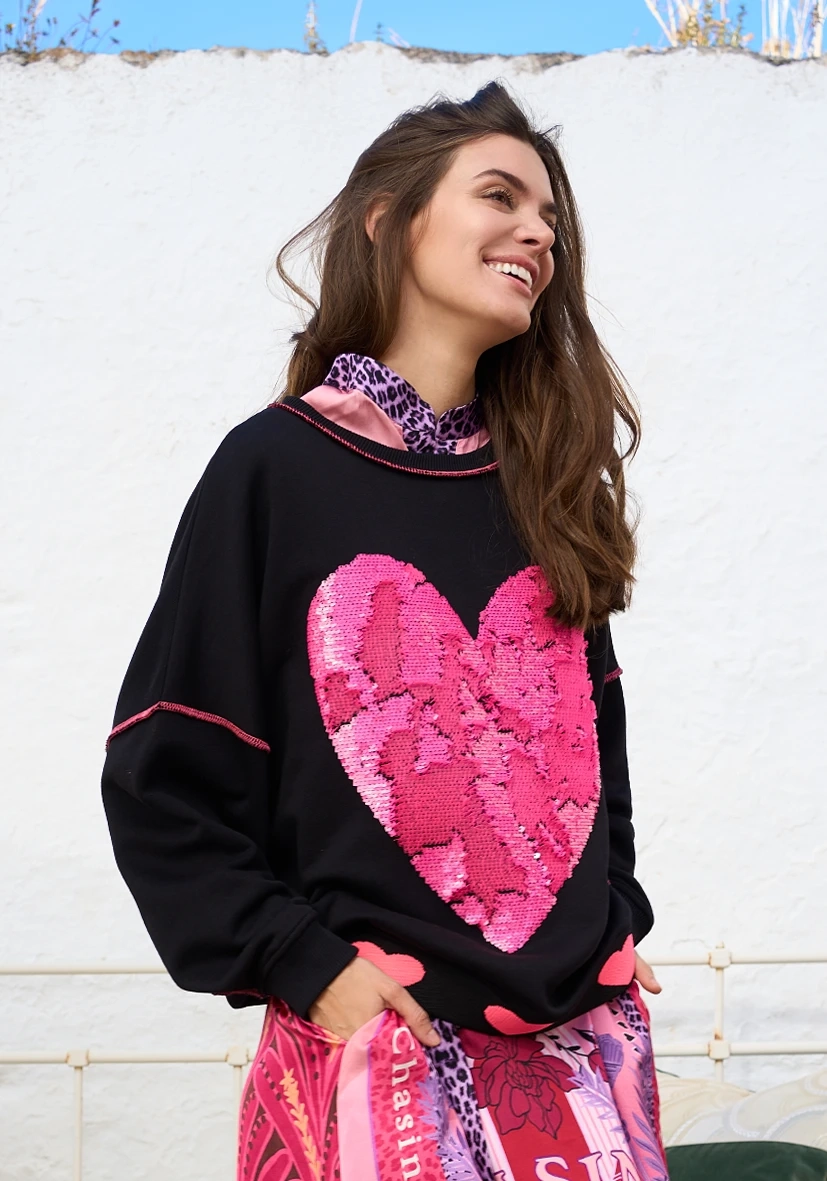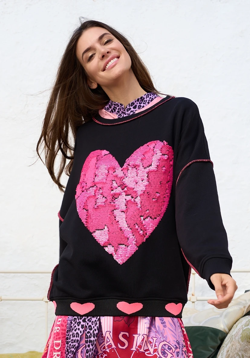 En rundhalset sweater med store pailletapplikationer, sænkede skuldre med kontrastsyninger og en legende jacquardkant med hjerter. En stilfuld allrounder, der gør ethvert outfit til et blikfang.